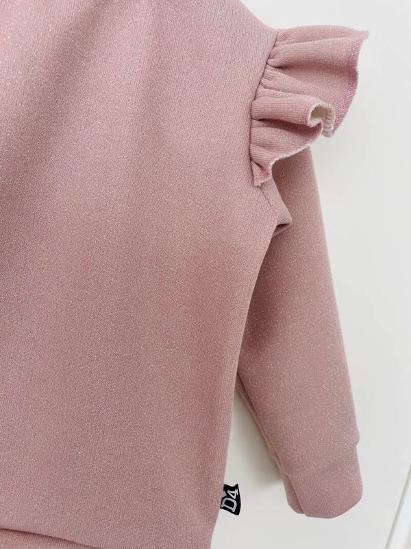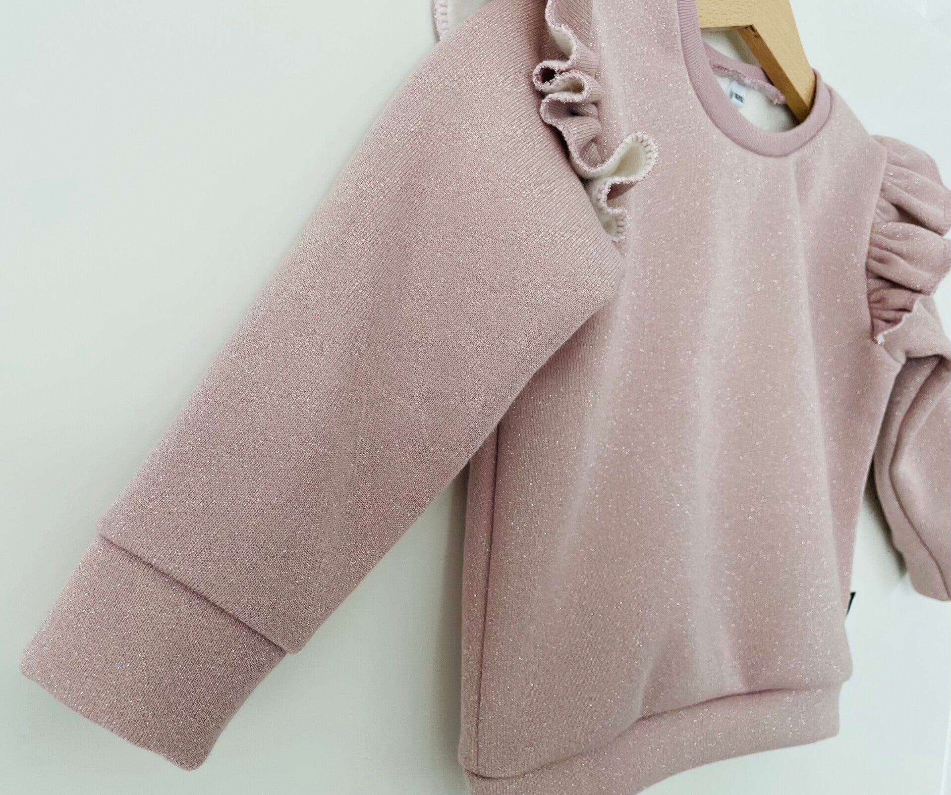 Sweater heeft een boordstof rond de halsopening en de sweaterstof aan de onderkant en onder aan de mouwen. Aan de mouwen zit een leuk ruffle detail.