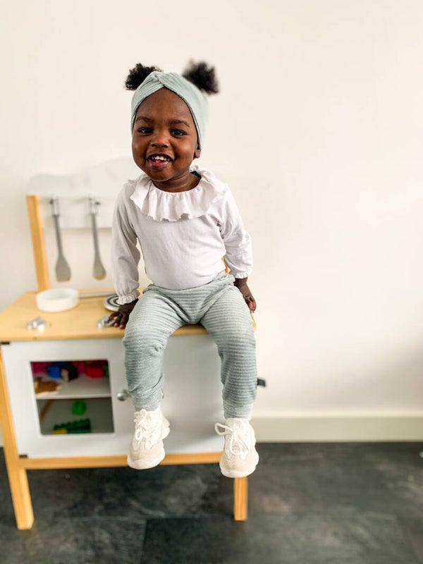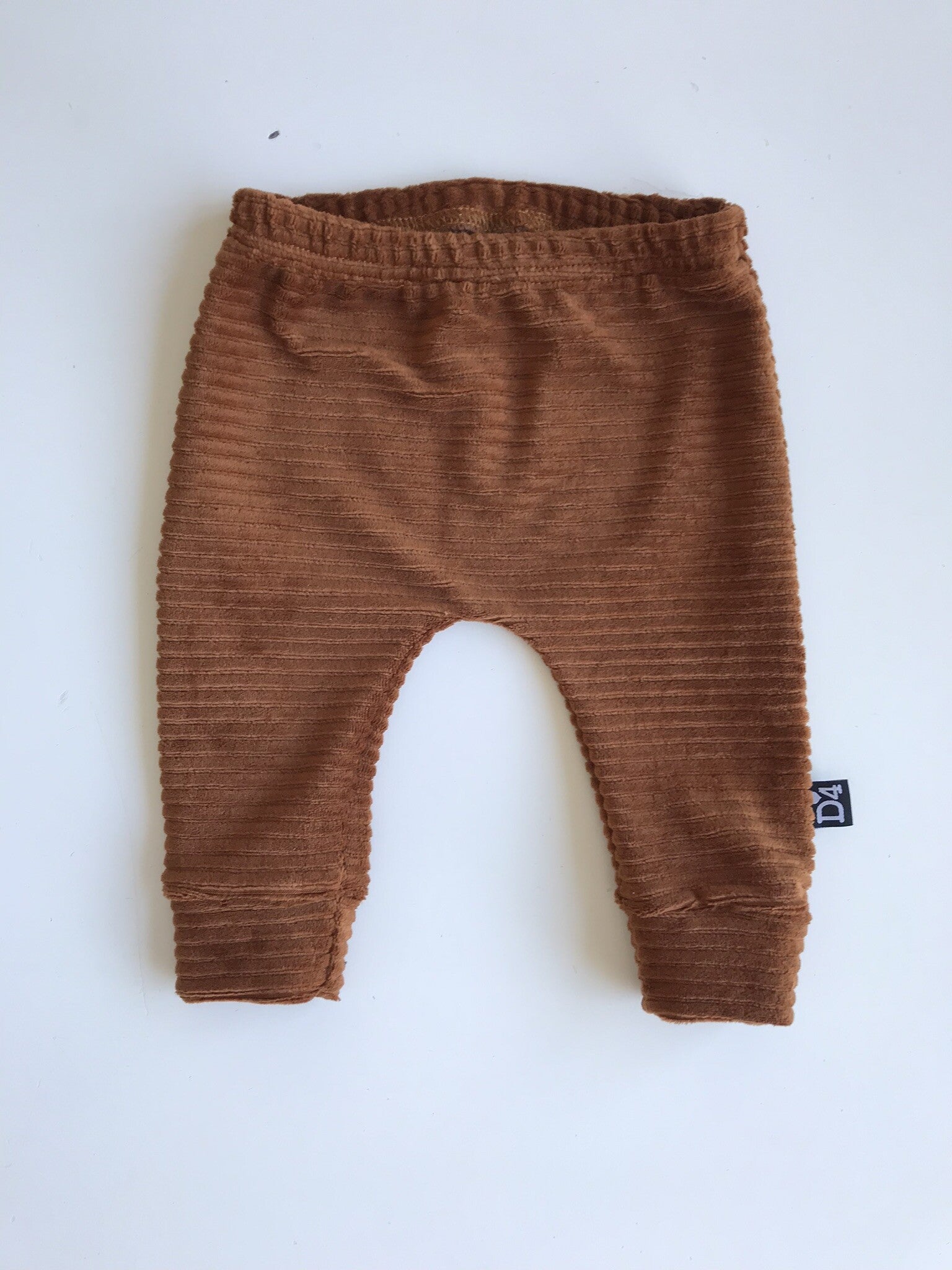 Broekje van zacht katoenen rib fluweel met zacht elastiek in de taille en een boord onder aan de pijpen.