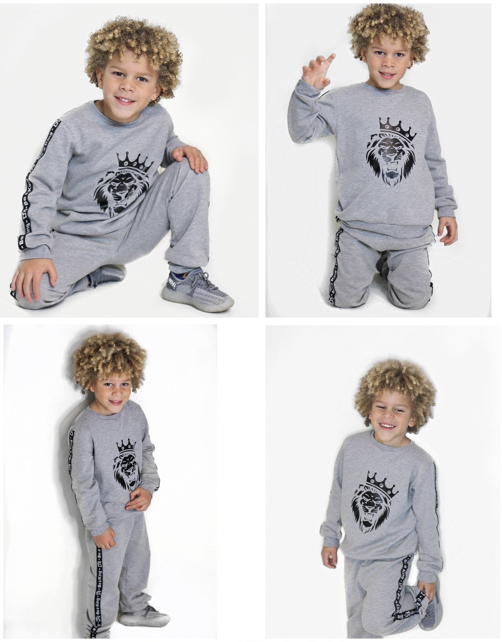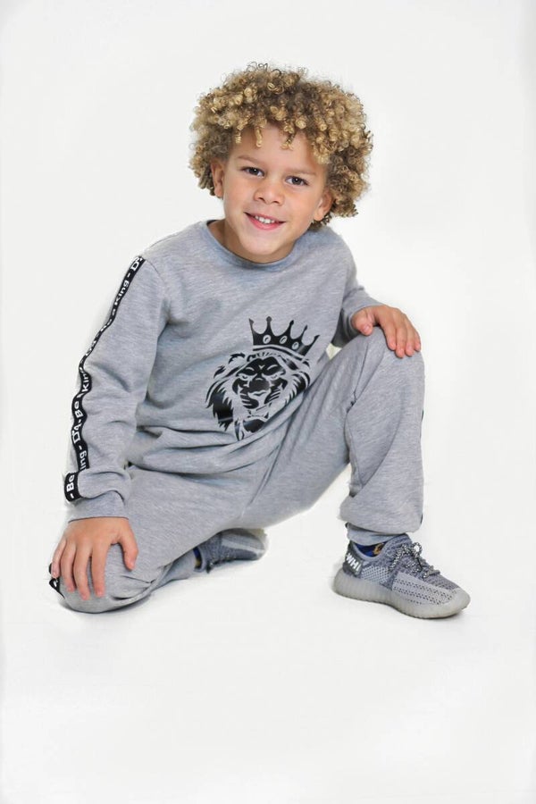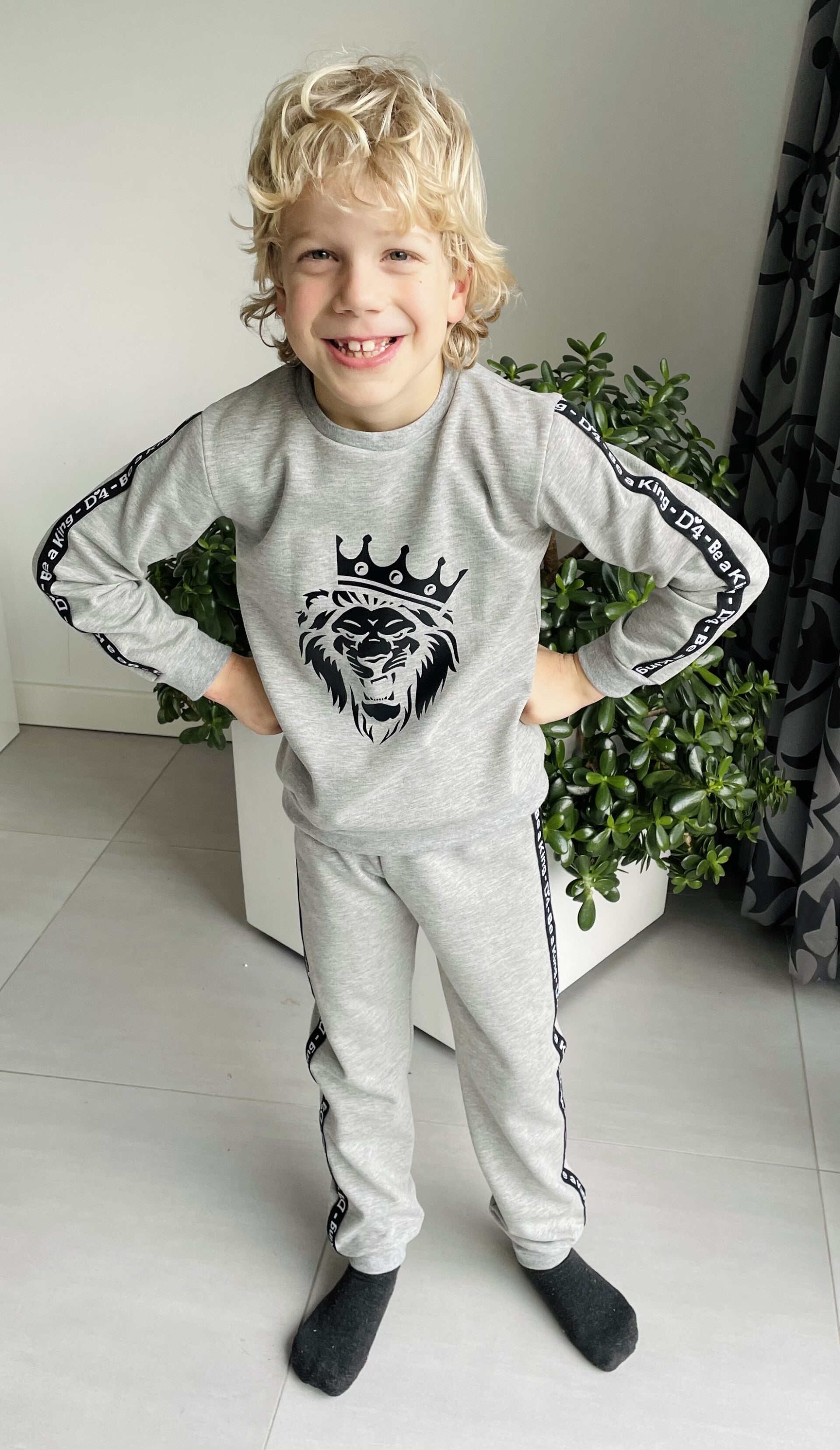 Mooie Licht grijze sweater met stoere band op de mouwen en een stoere leeuw applicatie