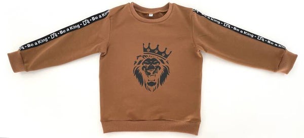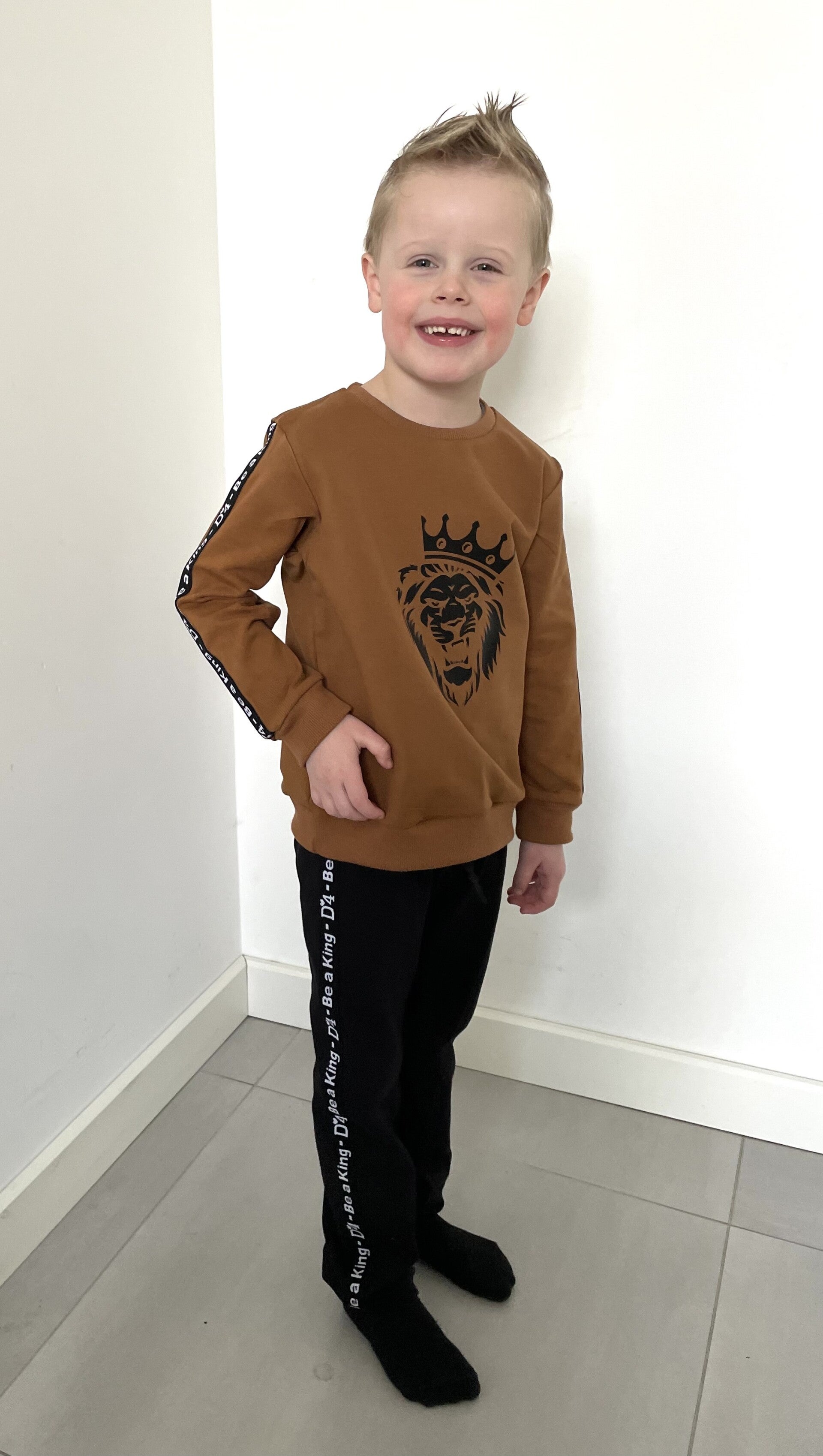 Mooie Mocca kleurige sweater met stoere band op de mouwen en een stoere leeuw applicatie