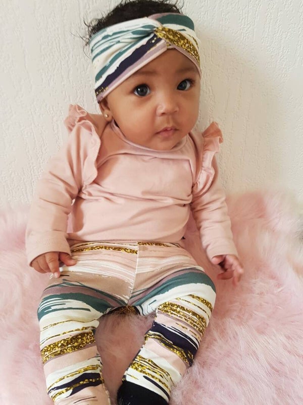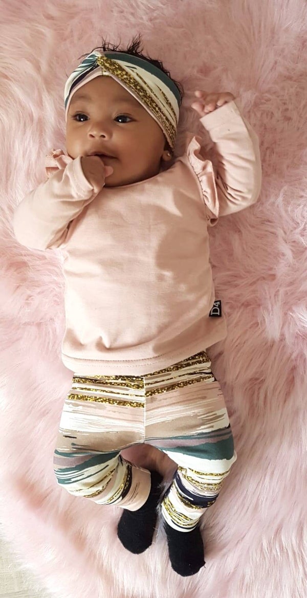 Setje bestaande uit:- Twisted headband sparkle stripes - Ruffle shirt powder pink- Cuff legging sparkle stripes