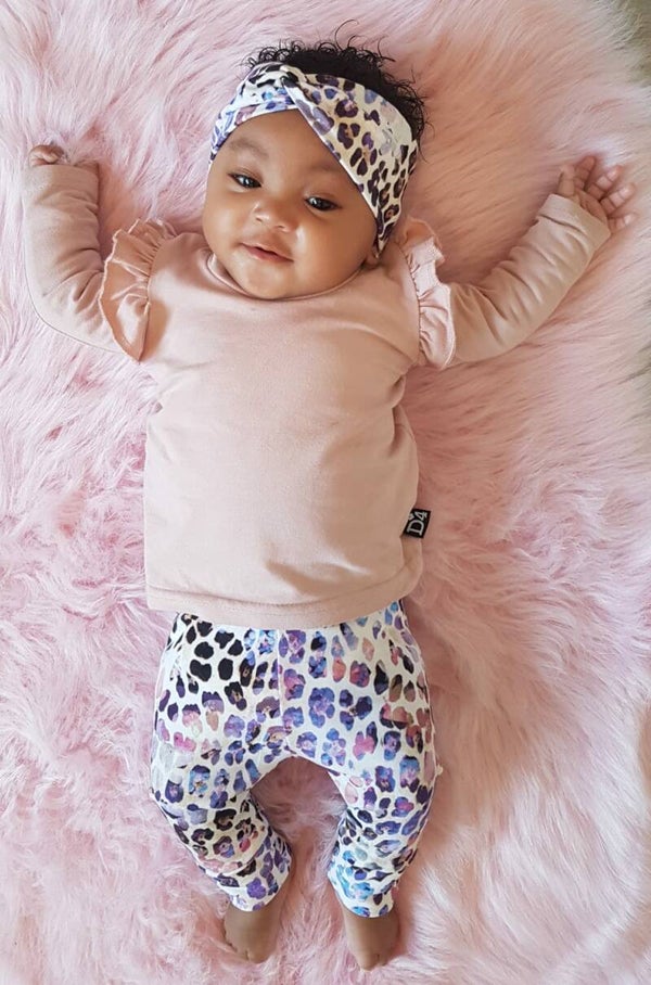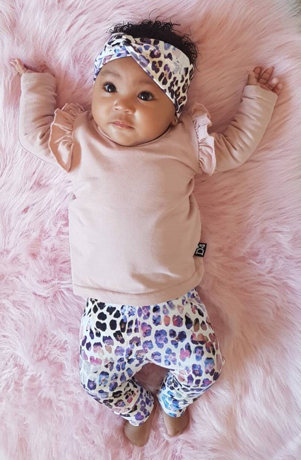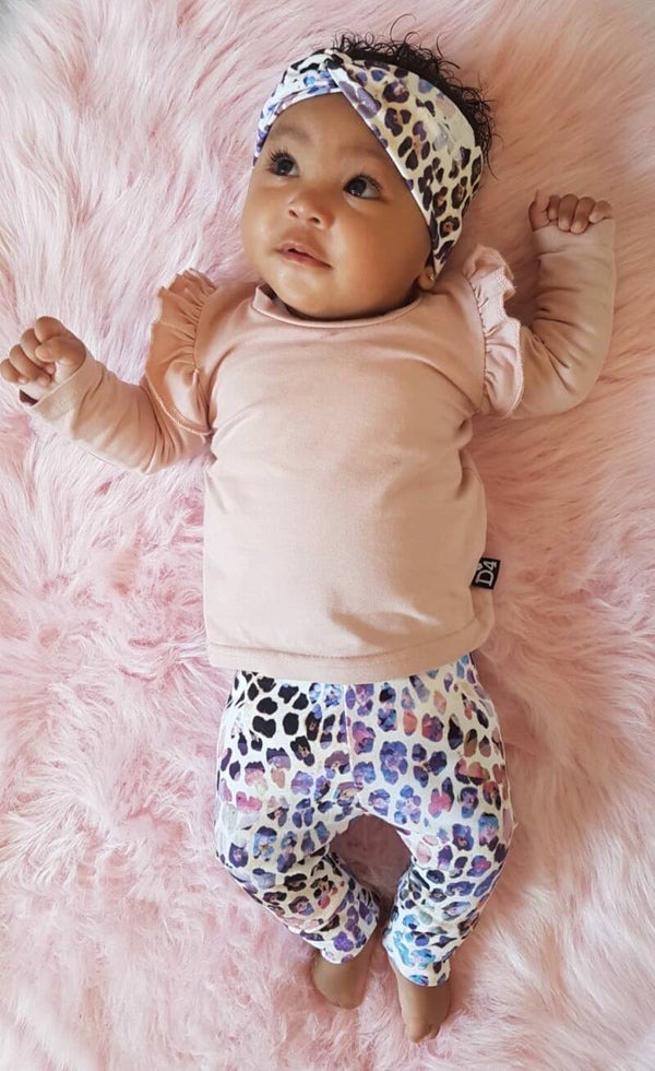 Setje bestaande uit:- Twisted headband leopard rainbow- Ruffle shirt powder pink- Cuff legging leopard rainbow