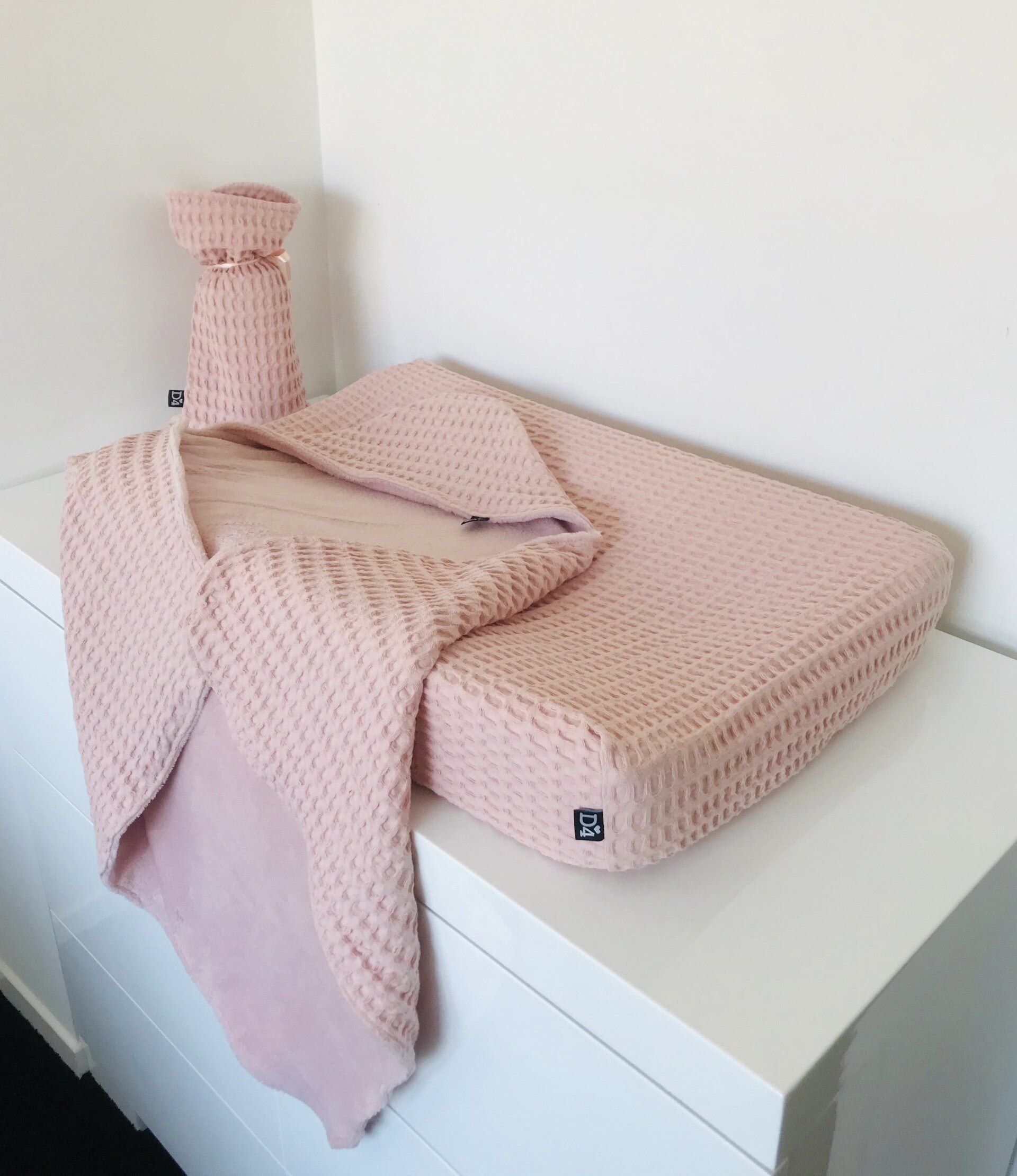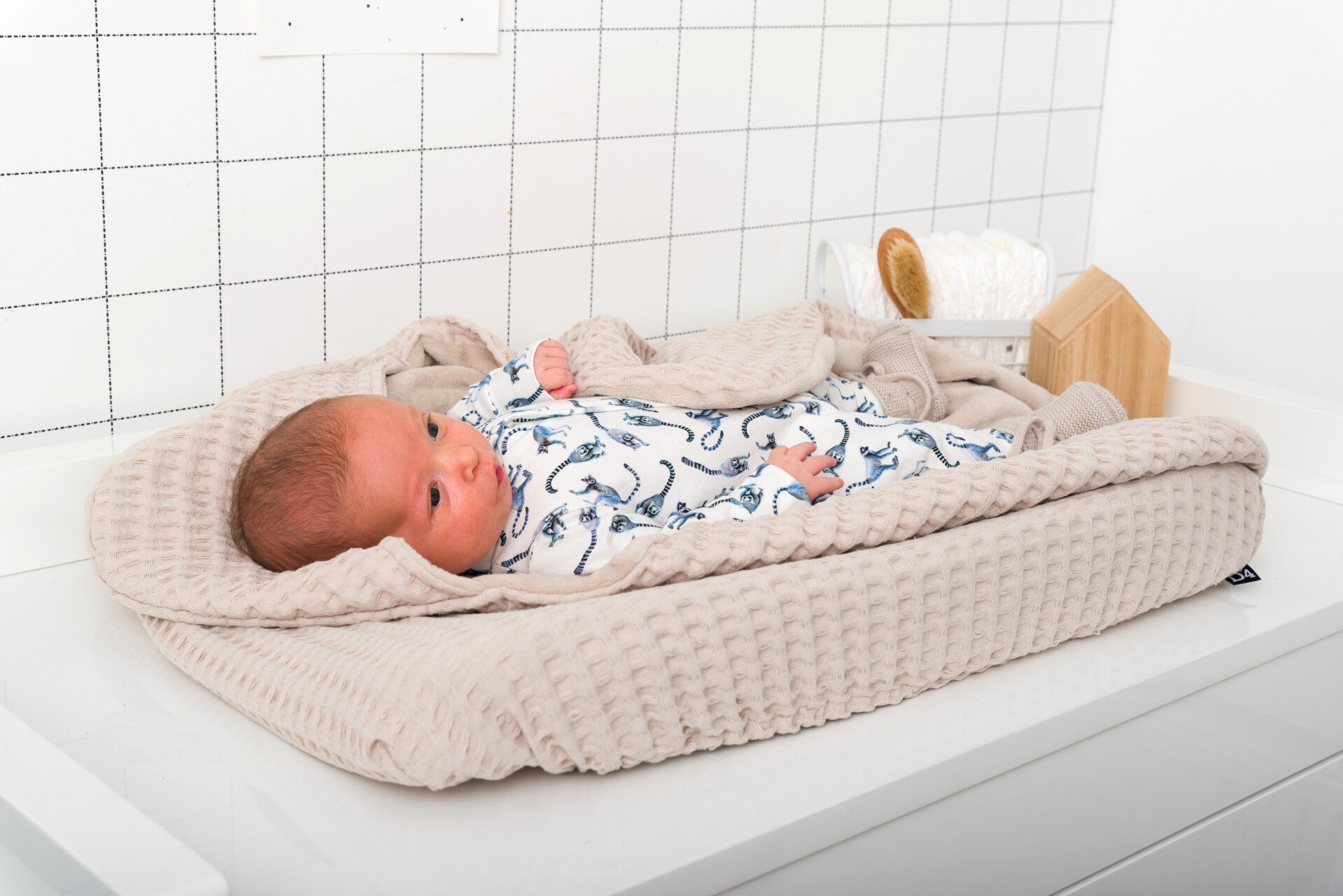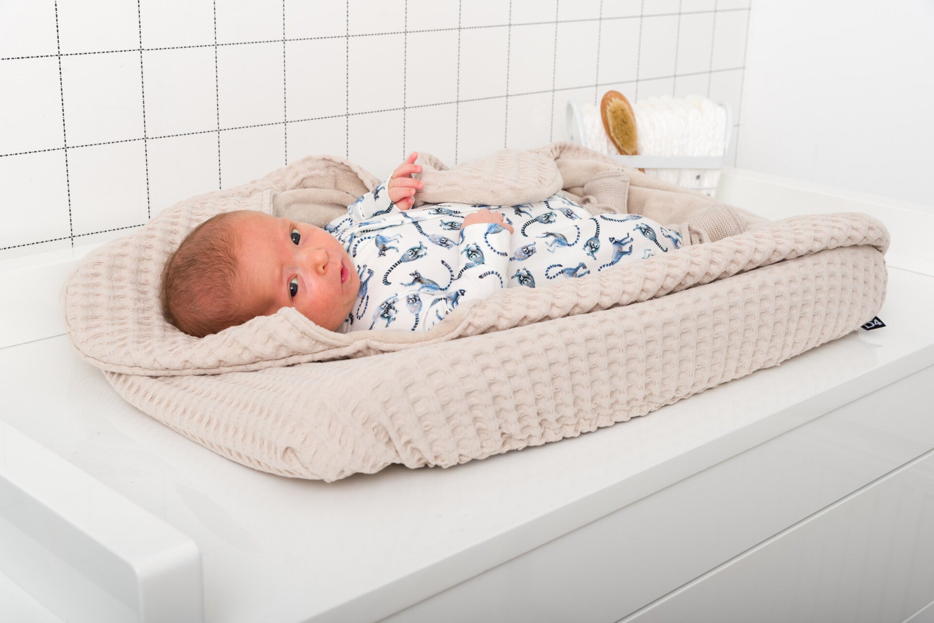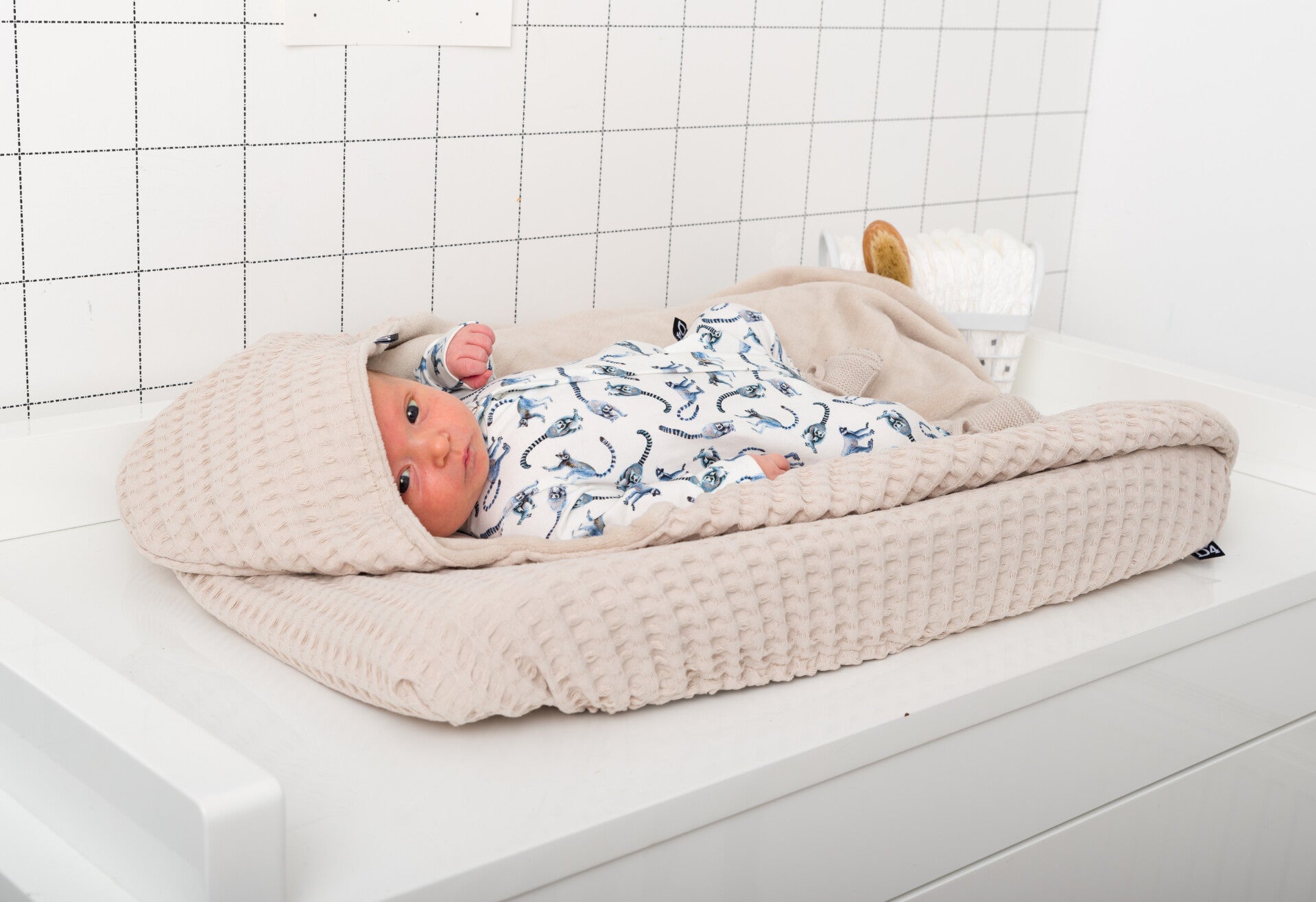 Deze aankleedkussenhoes is gemaakt van een heerlijk zachte wafelstof van 100% katoen en daar comfortabel voor je kindje als deze verschoond of aangekleed met worden.