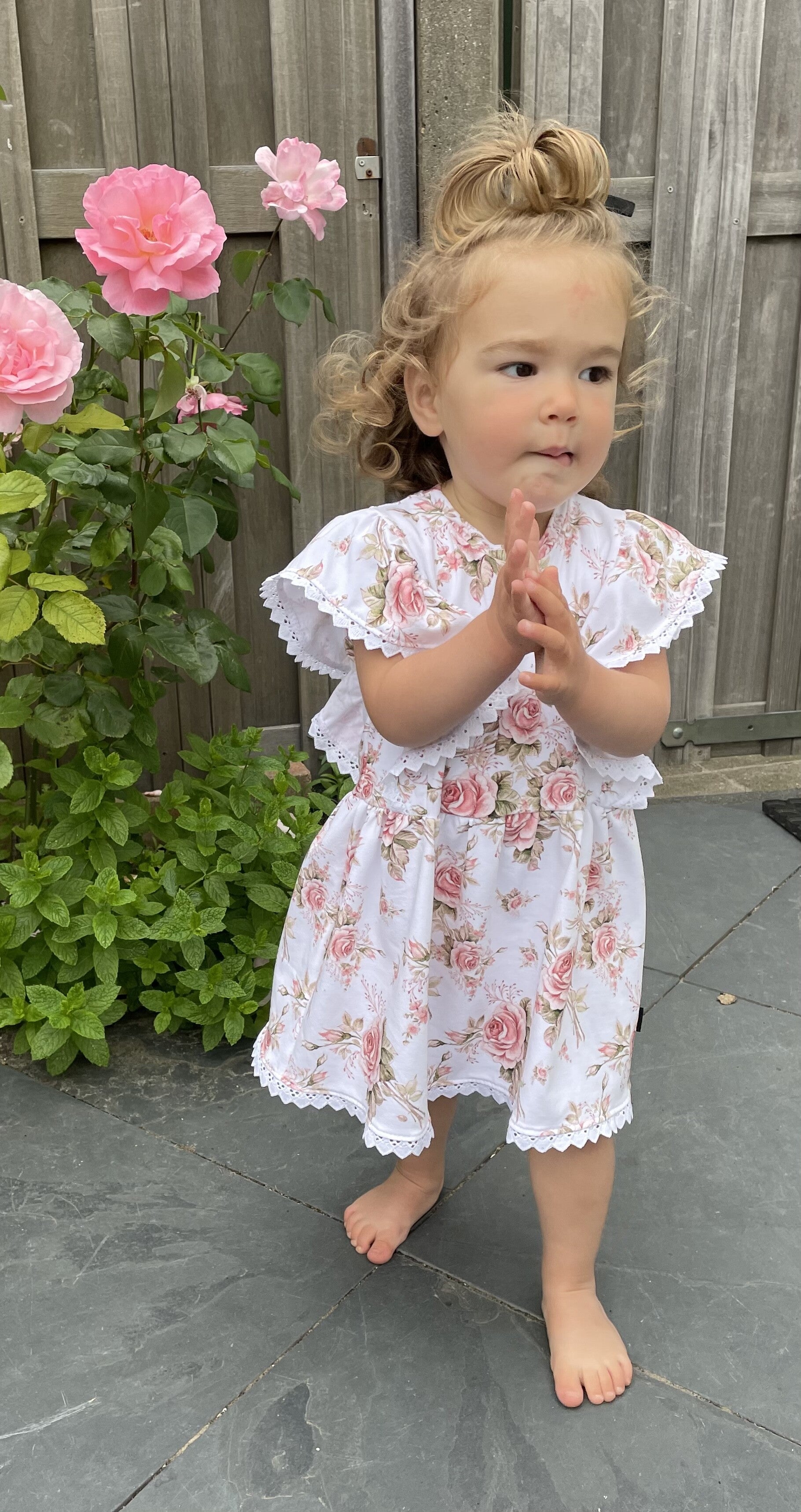 Dit jurkje sluit aan van boven en heeft mooie kanten ruffles over het schouder gedeelte het aangerimpelde rok gedeelte valt wat wijder. De stof is gemaakt van een heerlijk zachte rekbare Tricot stof.