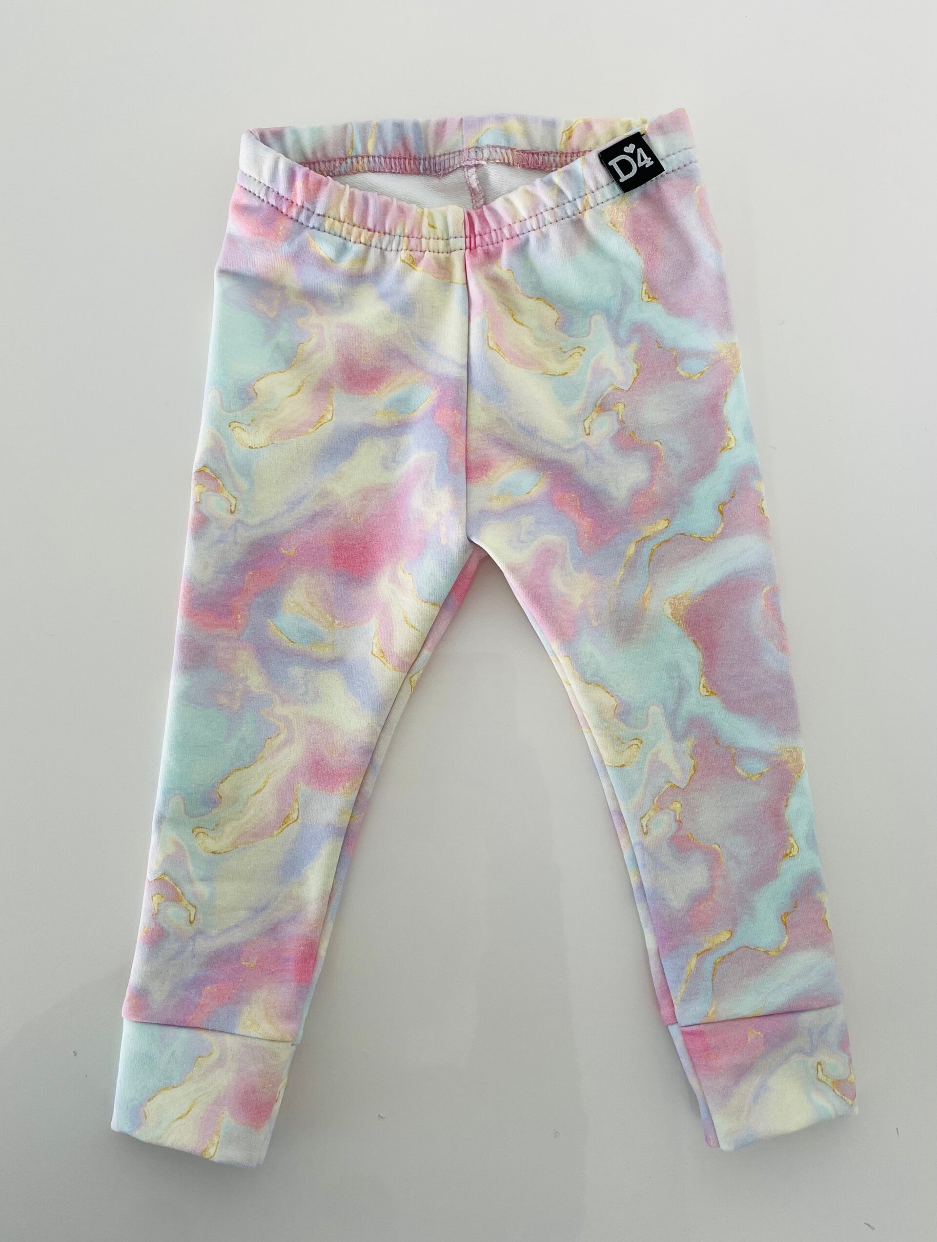 Een tricot legging van zacht katoen met elastiek in de taille en boorden aan de broekspijpen.